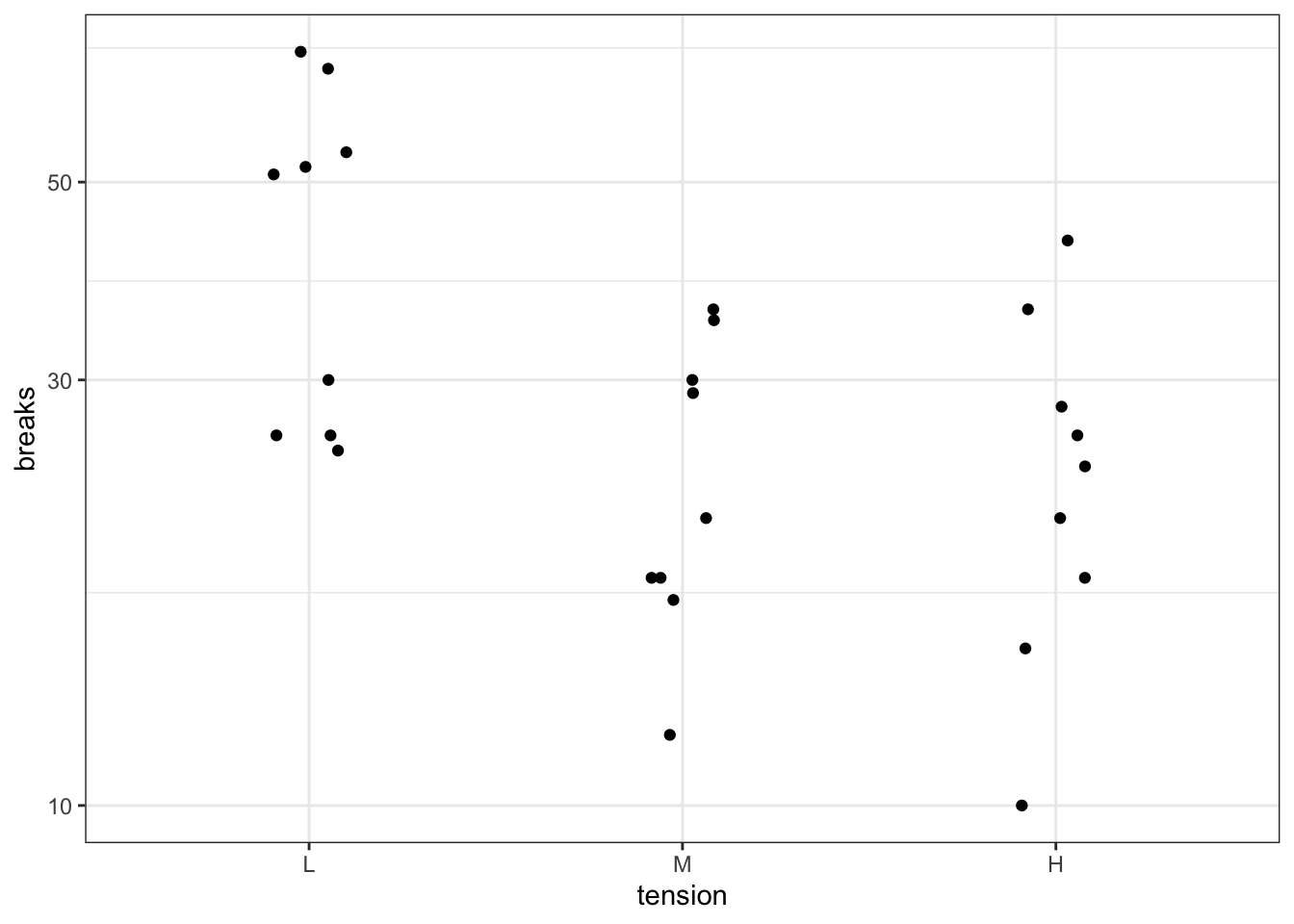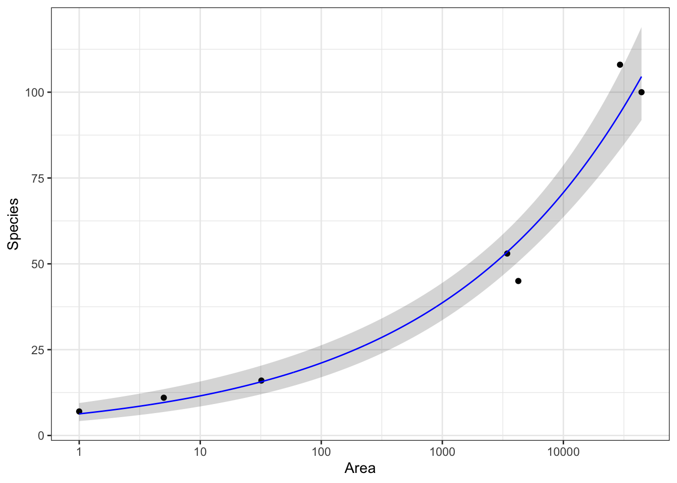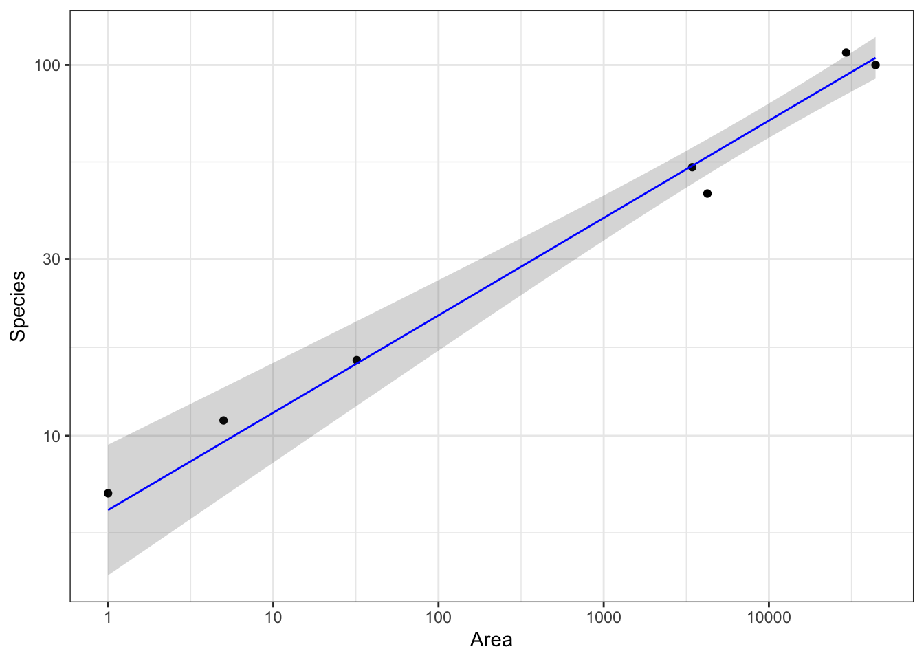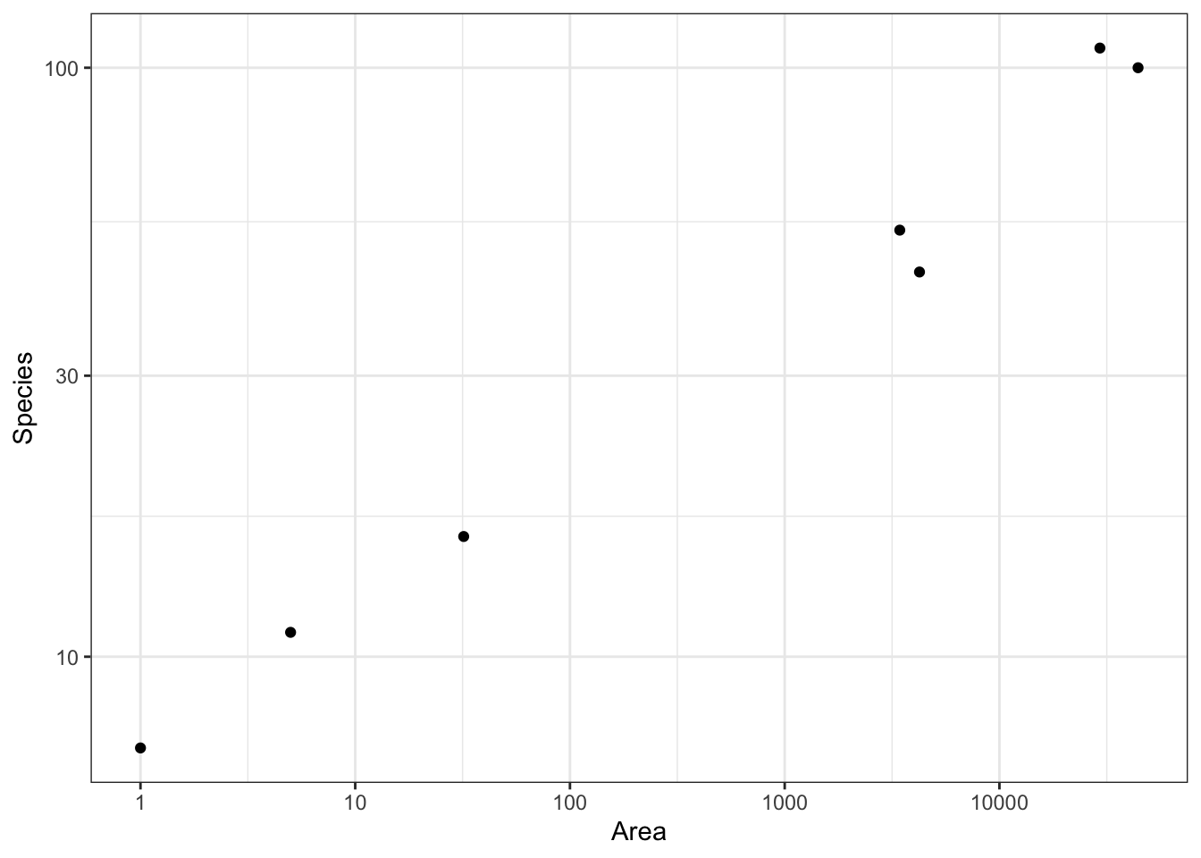 # case0801g <-ggplot(case0801,aes(x = Area,y = Species)) +geom_point() +scale_x_log10() # Through trial and error plotting # x and y on logarithmic axis looks the most linearg +scale_y_log10()