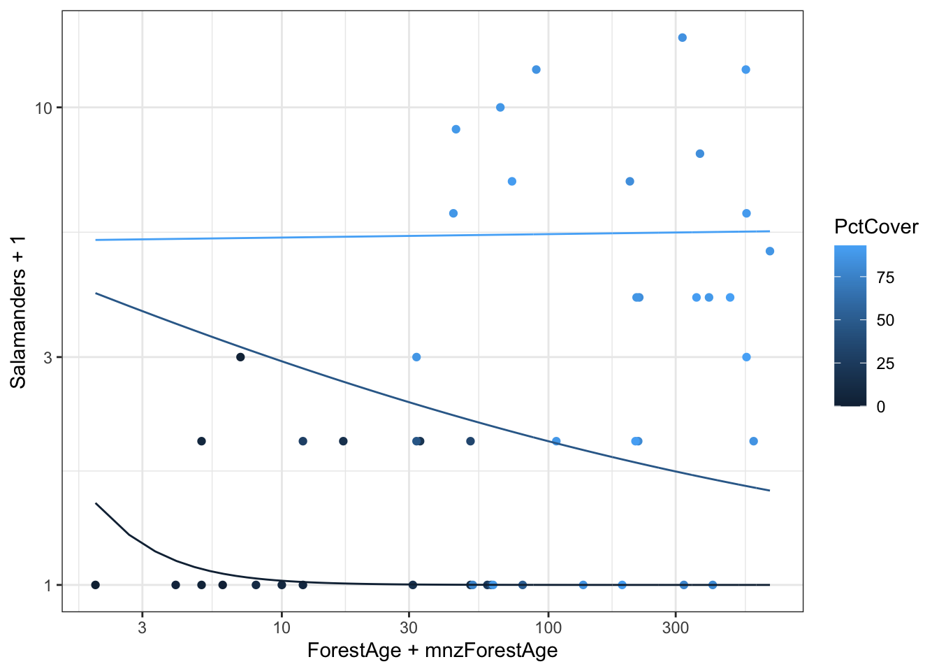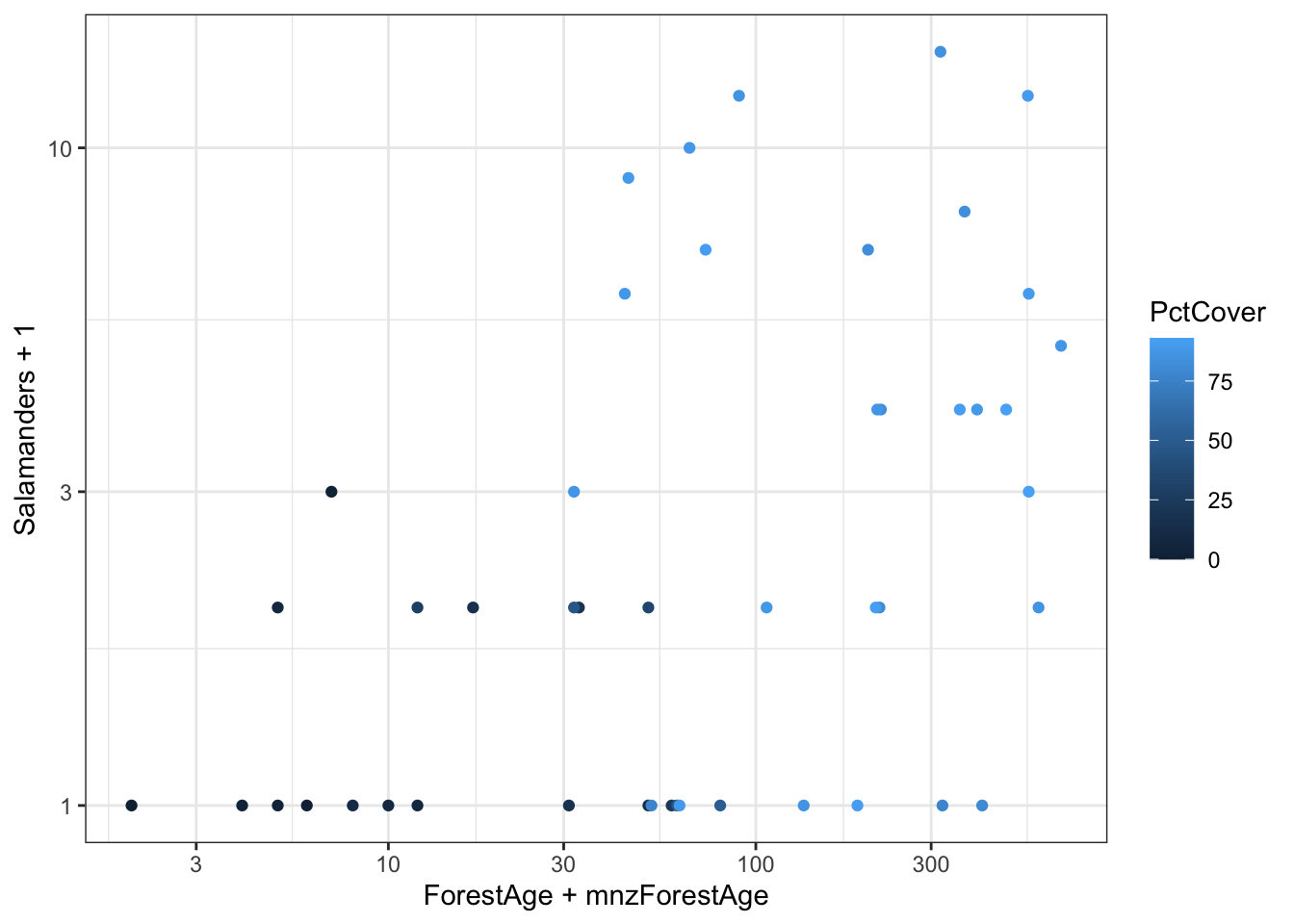 # Function to extract minimum non-zero valuemin_nonzero <-function(x) { min(x[x>0]) }# Find minimum nonzeromnzForestAge <-min_nonzero(case2202$ForestAge)mnzPctCover <-min_nonzero(case2202$PctCover)g <-ggplot(case2202,aes(x = ForestAge + mnzForestAge,y = Salamanders +1,color = PctCover)) +geom_point() g +scale_x_log10() +scale_y_log10()