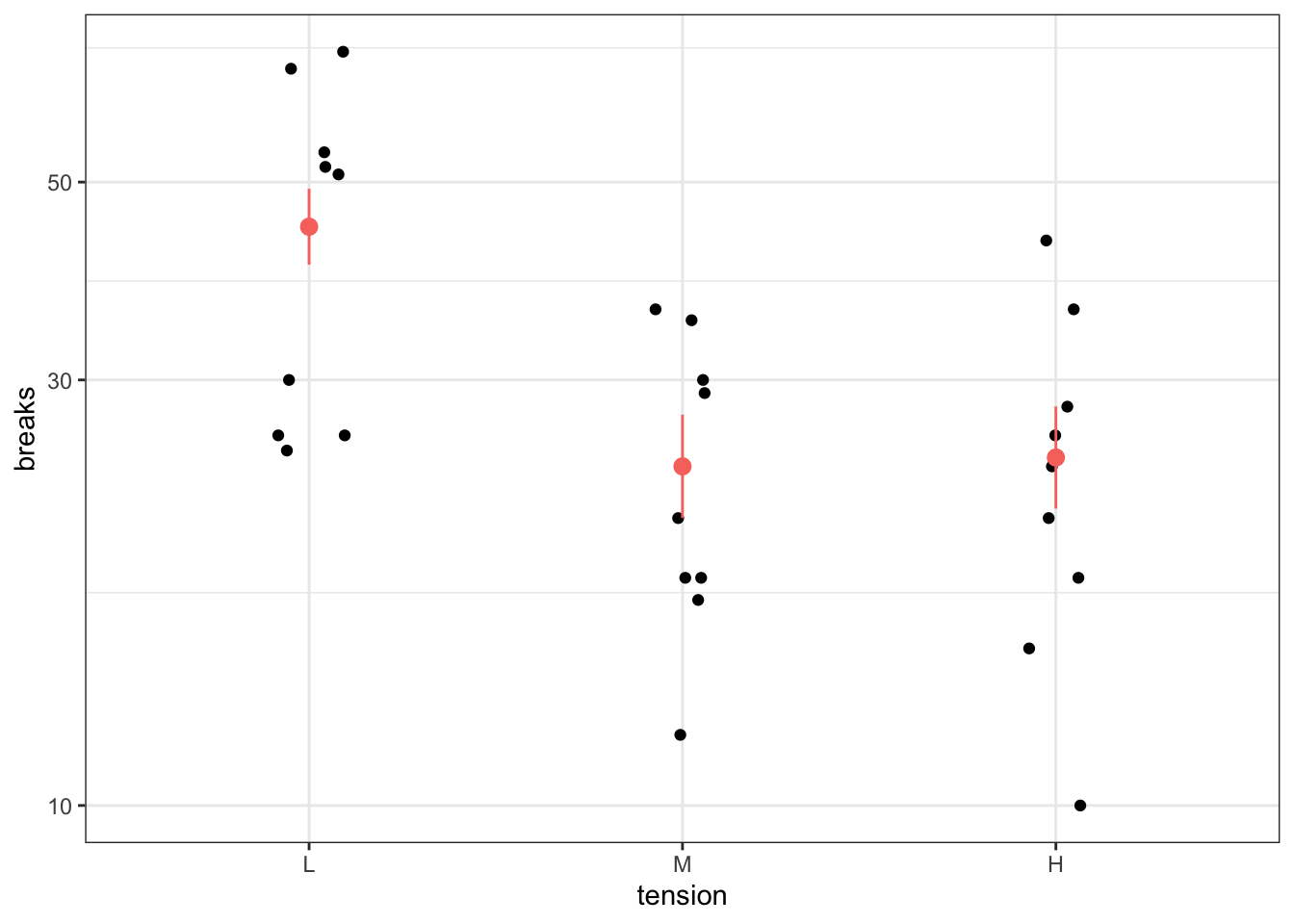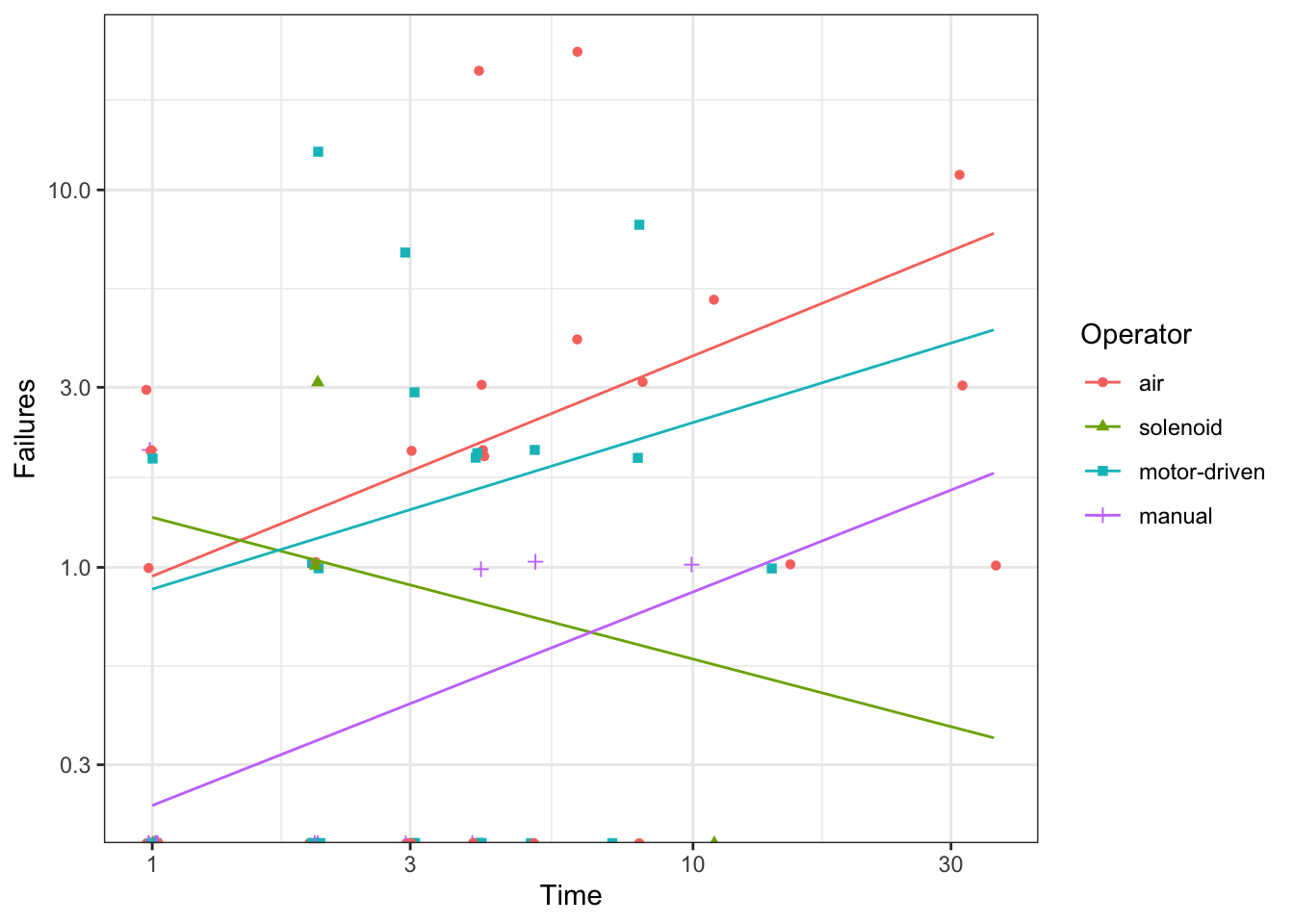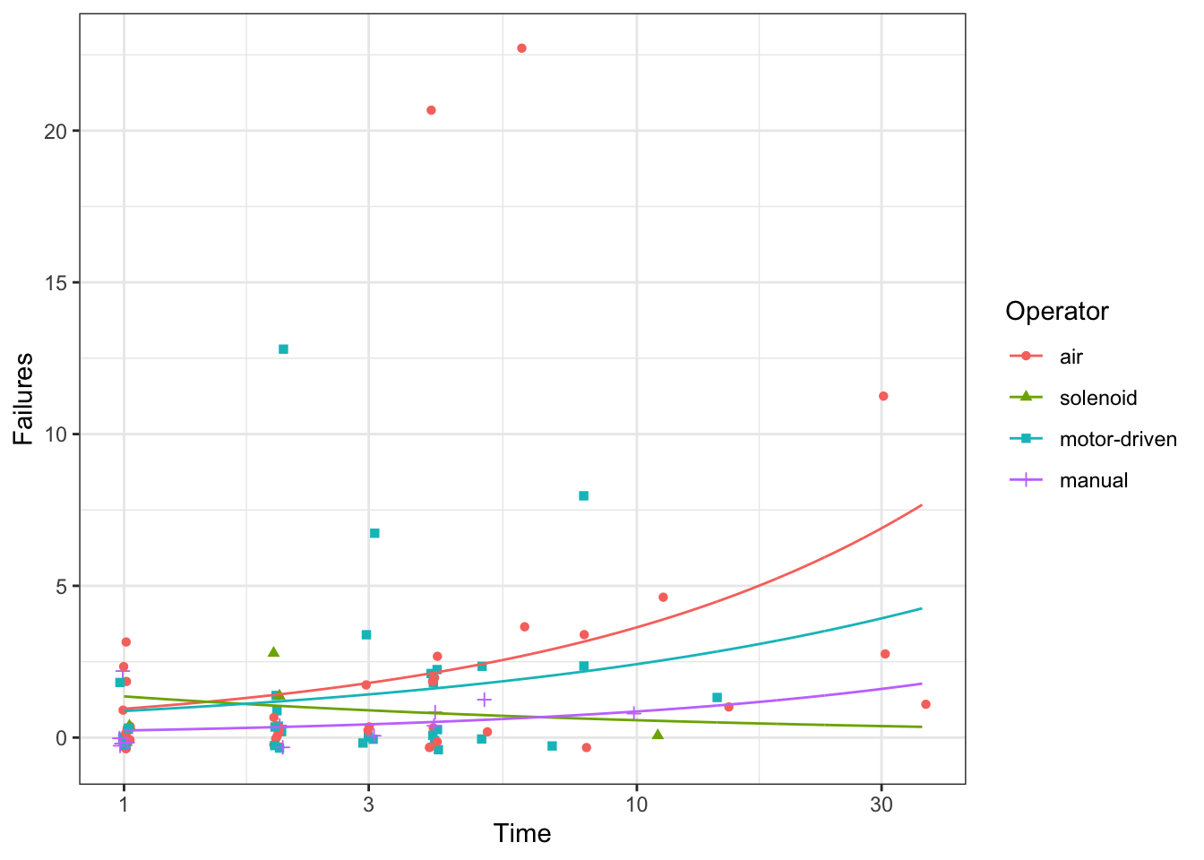 # Predictionsp <-bind_cols( nd,predict(m,newdata = nd,se.fit =TRUE)|>as.data.frame() |># Manually construct confidence intervalsmutate(lwr = fit -qnorm(0.975) * se.fit,upr = fit +qnorm(0.975) * se.fit,# Exponentiate to get to response scaleFailures =exp(fit),lwr =exp(lwr),upr =exp(upr) ) )