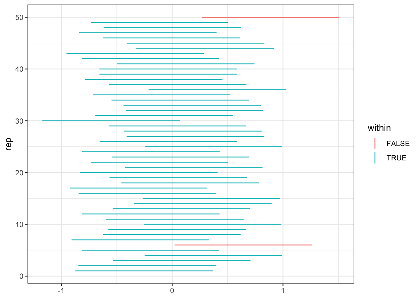 This figure visualizes the first 50 confidence intervals constructed in our simulation. We are only visualizing the first 50 because it is hard to visualize 1,000 intervals simultaneously. Some of the intervals will contain the truth (within = TRUE) and some will not (within = FALSE). On overage, intervals constructed using this procedure will contain the truth 100(1-\(\alpha\))% of the time.