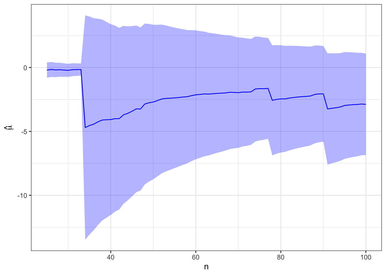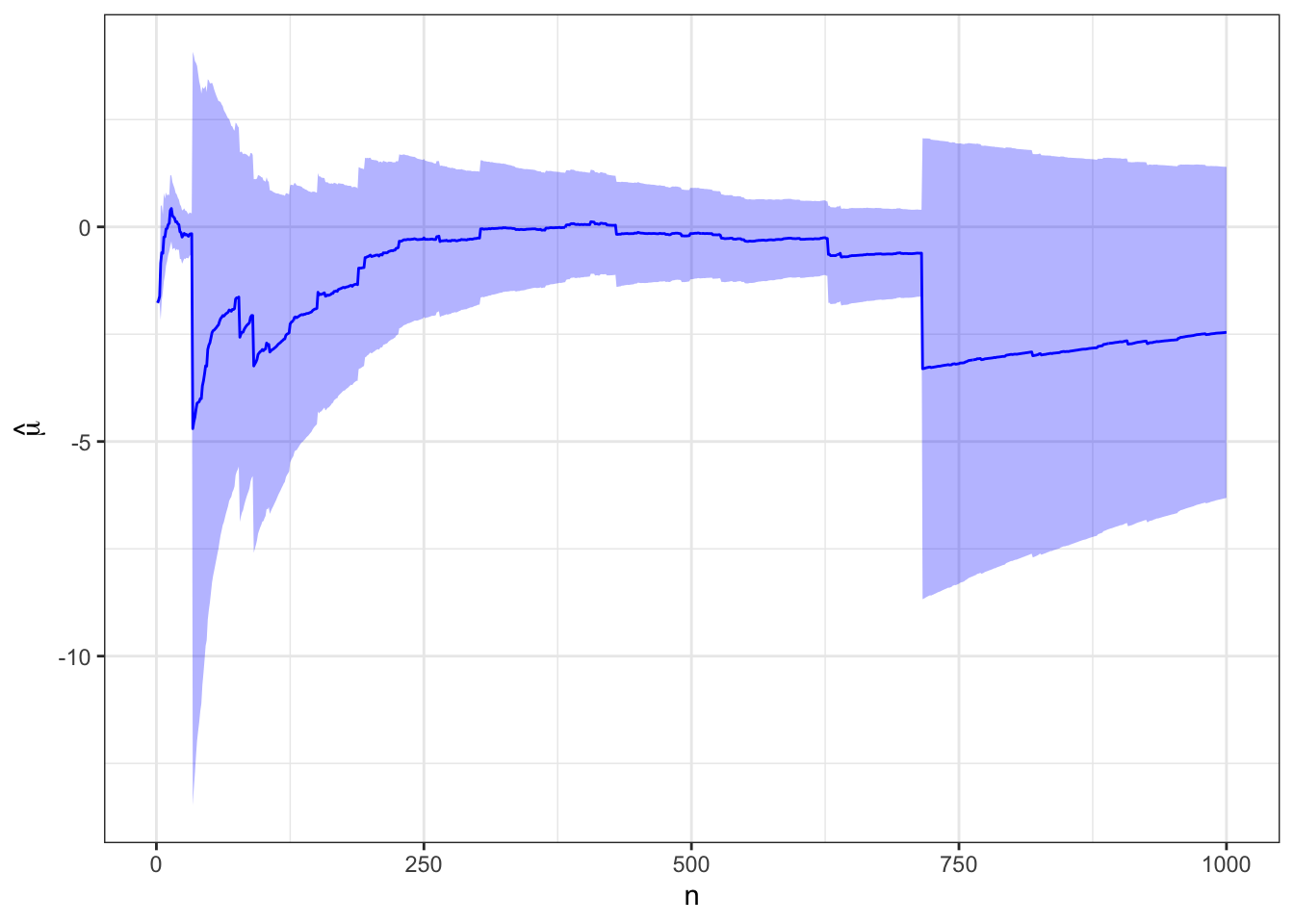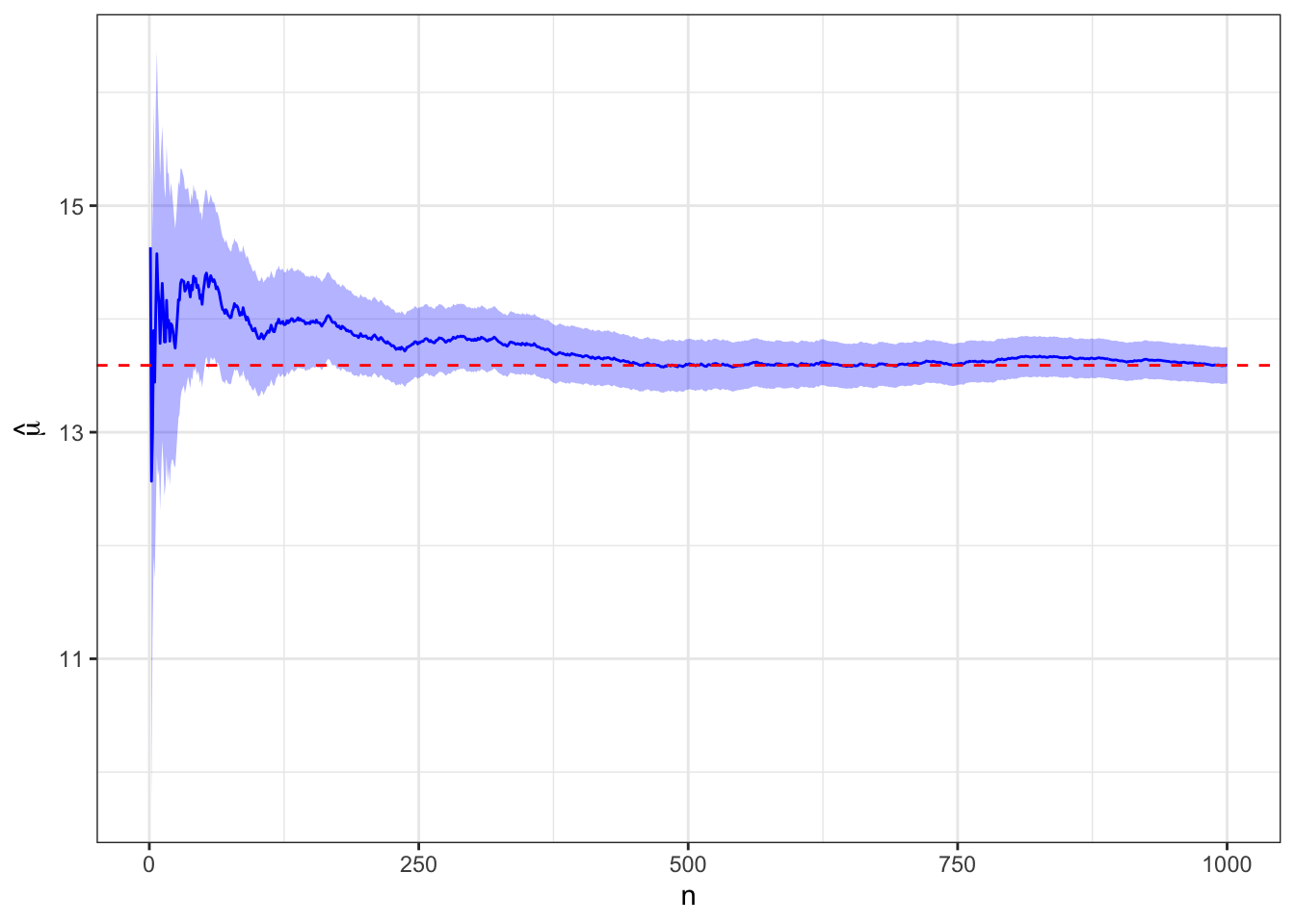 # Function to cumulative expectation with confidence intervalplot_expectation <-function(d, truth =NULL) { g <-ggplot(d, aes(x = n, y = xbar, ymin = lcl, ymax = ucl)) +geom_ribbon(fill ="blue", alpha =0.3) +geom_line(color ="blue") +labs(y =bquote(hat(mu)) )if (!is.null(truth)) g <- g +geom_hline(yintercept = truth, color ="red", linetype =2)return(g)}