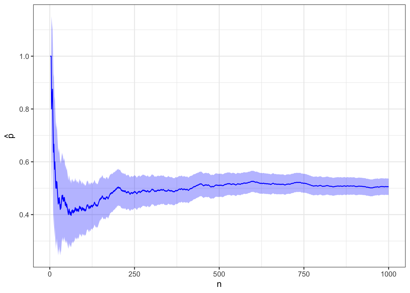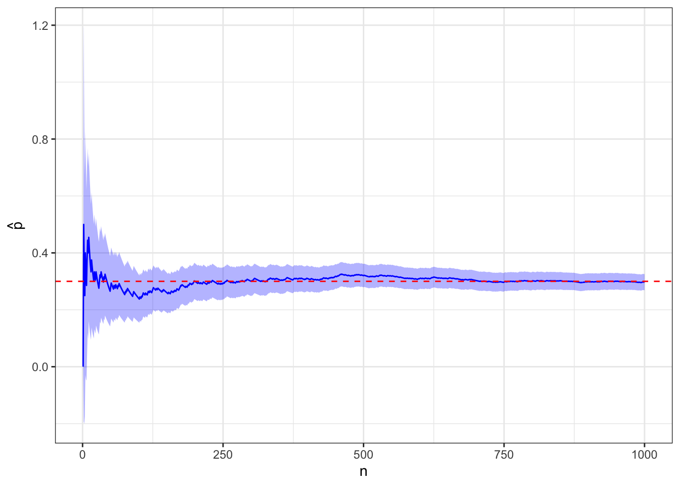 # Function to plot cumulative proportion with CIplot_proportion <-function(d, truth =NULL) { g <-ggplot(d, aes(x = n, y = p_hat, ymin = lcl, ymax = ucl)) +geom_ribbon(fill ="blue", alpha =0.3) +geom_line(color ="blue") +labs(y =bquote(hat(p)) )if (!is.null(truth)) g <- g +geom_hline(yintercept = truth, color ="red", linetype =2)return(g)}