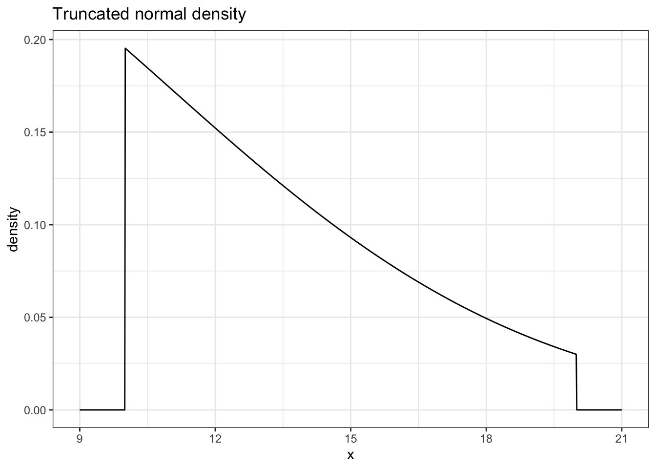 # Pick these valuesm <-3# untruncated expectations <-8# untruncated standard deviationa <-10# lower truncation boundb <-20# upper truncation bound# Plot densityggplot(data.frame(x =c(a -1, b +1)),aes(x = x)) +stat_function(fun = dtnorm,n =1001, args =list(mean = m,sd = s,a = a,b = b )) +labs(title ='Truncated normal density',y ="density" )