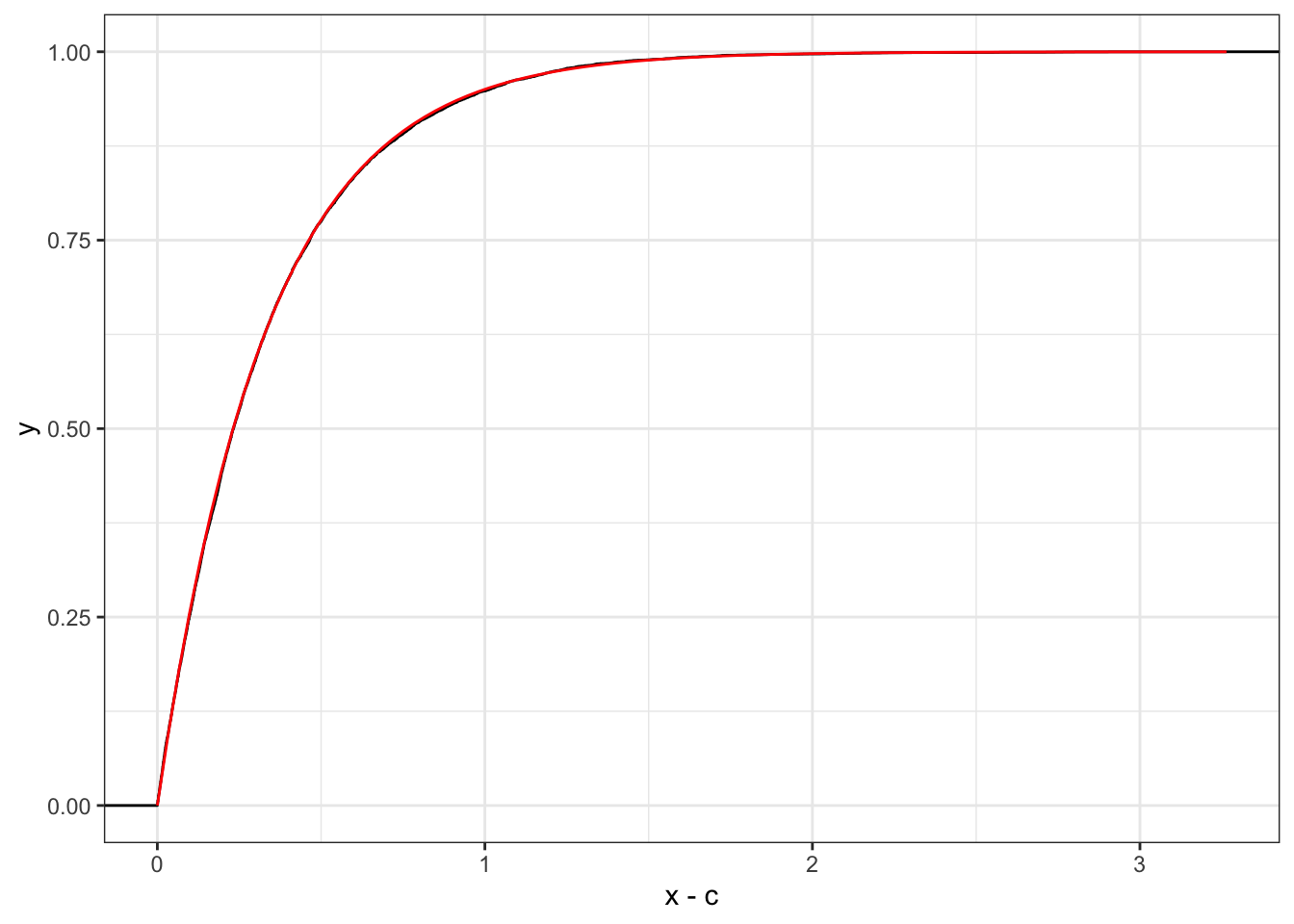 # Plot density for conditionalggplot(data.frame(x = x), aes(x - c) # performs the shift) +stat_ecdf() +stat_function(fun = pexp, args =list(rate = r), color ="red")