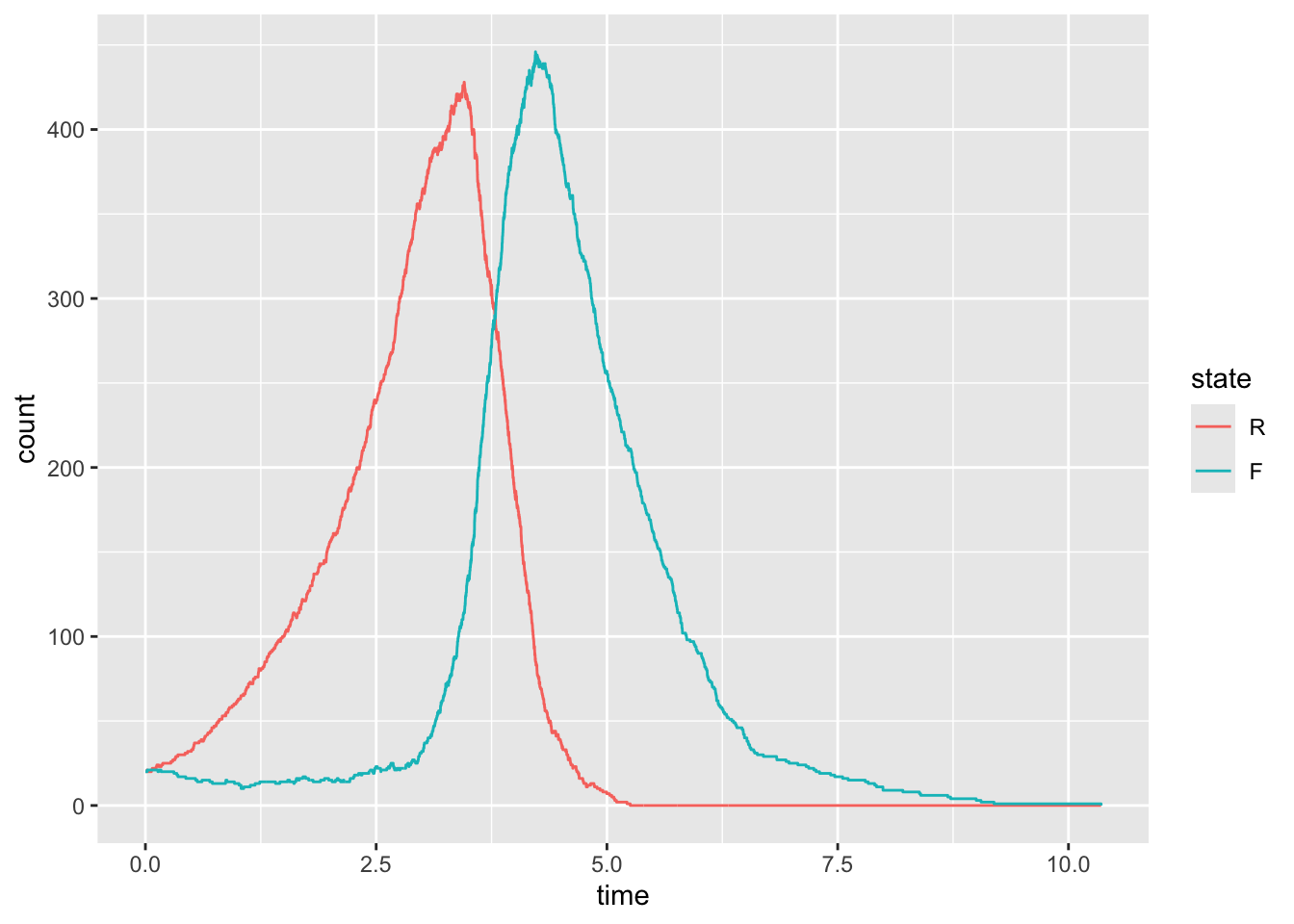 simulate_predator_prey_system <-function(initial_state, rate, max_rxns =1e4) {# Create storage structures for state and time n_possible_rxns <- max_rxns +1 state <-matrix(initial_state, nrow =2, ncol = n_possible_rxns) n_rxns <-1 time <-rep(0, n_possible_rxns) # Simulate outbreakwhile(state[2,n_rxns] >0& n_rxns <= max_rxns ) { tmp <-simulate_transition(state[,n_rxns], rate, time[n_rxns]) n_rxns <- n_rxns +1 time[n_rxns] <- tmp$time state[,n_rxns] <- tmp$state } d <-data.frame(R = state[1, ],F = state[2, ],time = time ) |>pivot_longer(-time, names_to ="state", values_to ="count") |>mutate(state =factor(state, levels =c("R","F")) )}