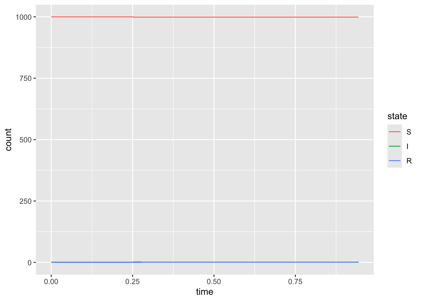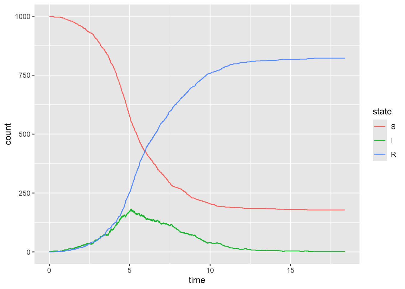 set.seed(1)d <-simulate_outbreak(c(1000, 1, 0), rate =c(2,1))ggplot(d, aes(x = time, y = count, color = state)) +geom_step()