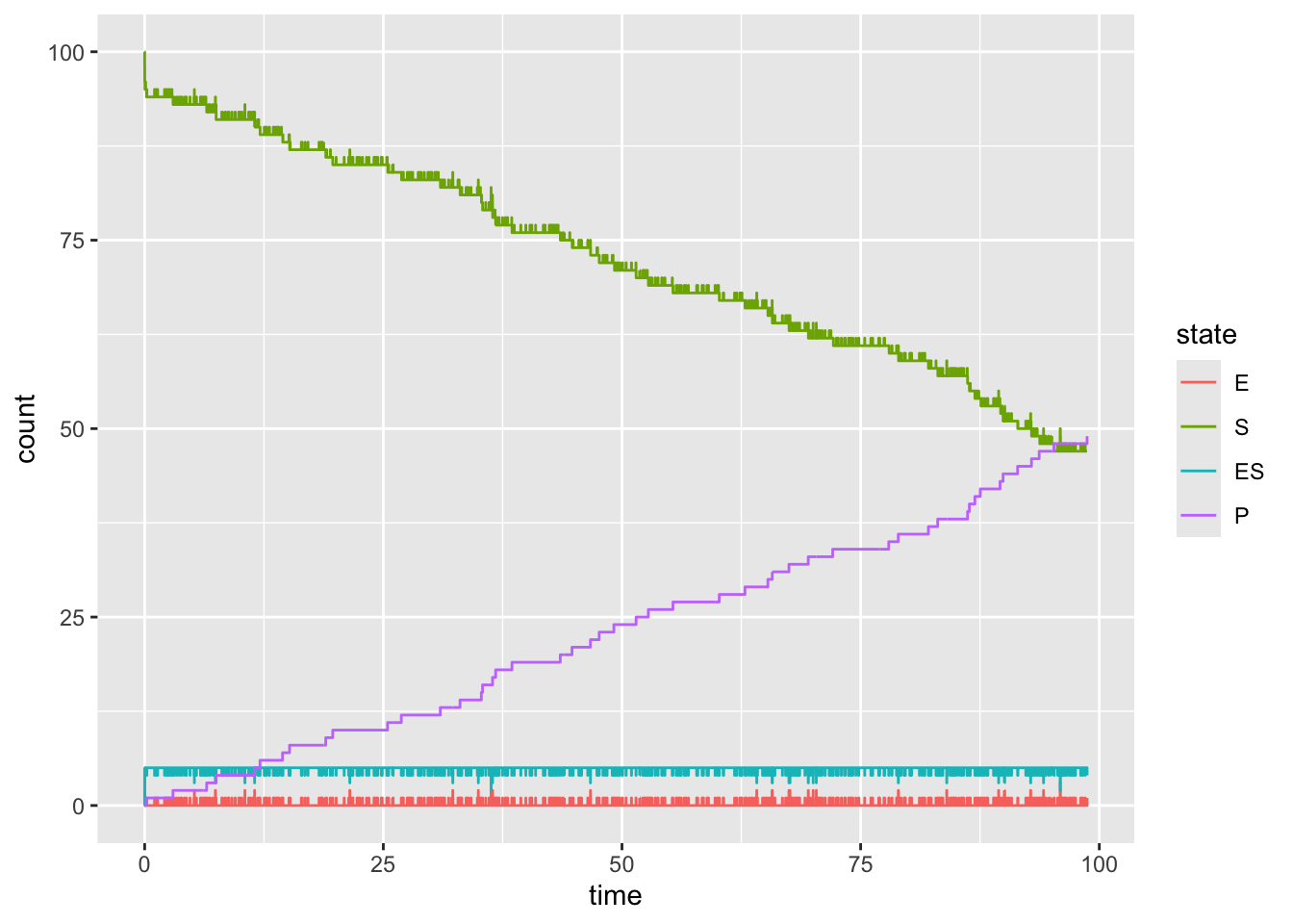 simulate_michaelis_menton_system <-function(initial_state, rate, max_rxns =1e3) {# Create storage structures for state and time n_possible_rxns <- max_rxns +1 state <-matrix(initial_state, nrow =4, ncol = n_possible_rxns) n_rxns <-1 time <-rep(0, n_possible_rxns) # Simulate outbreakwhile(any(state[2:3,n_rxns] >0) & n_rxns <= max_rxns) { tmp <-simulate_michaelis_menton_transition(state[,n_rxns], rate, time[n_rxns]) n_rxns <- n_rxns +1 time[n_rxns] <- tmp$time state[,n_rxns] <- tmp$state } d <-data.frame(E = state[1, ],S = state[2, ],ES = state[3, ],P = state[4, ],time = time ) |>pivot_longer(-time, names_to ="state", values_to ="count") |>mutate(state =factor(state, levels =c("E","S","ES","P")) )}
