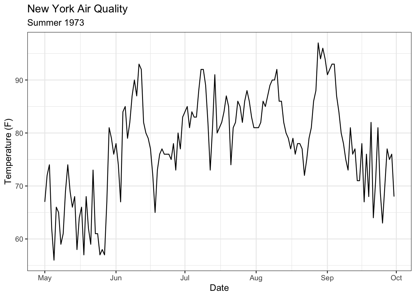 # Create date variable d <- airquality |>mutate(Date =as.Date(paste("1973", Month, Day,sep ="-")) ) |>select(-Month, -Day) # remove Month and Day variablesggplot(d, aes(x = Date,y = Temp)) +geom_line() +labs(title ="New York Air Quality",subtitle ="Summer 1973",y ="Temperature (F)" )