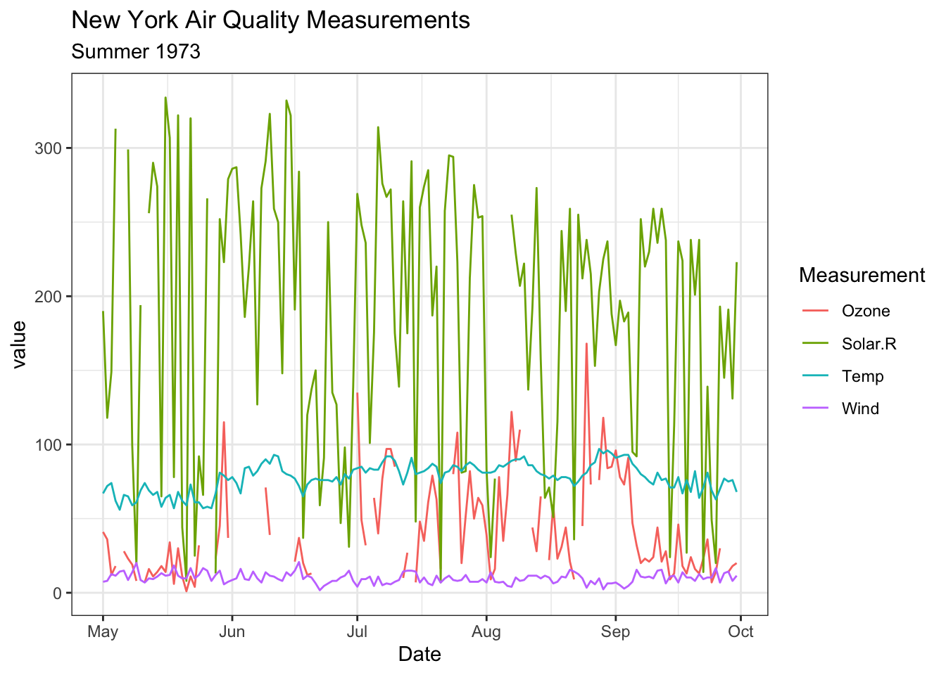 # Multiple geom_long()ggplot(d_long,aes(x = Date,y = value,color = Measurement )) +geom_line() +labs(title ="New York Air Quality Measurements",subtitle ="Summer 1973" )
