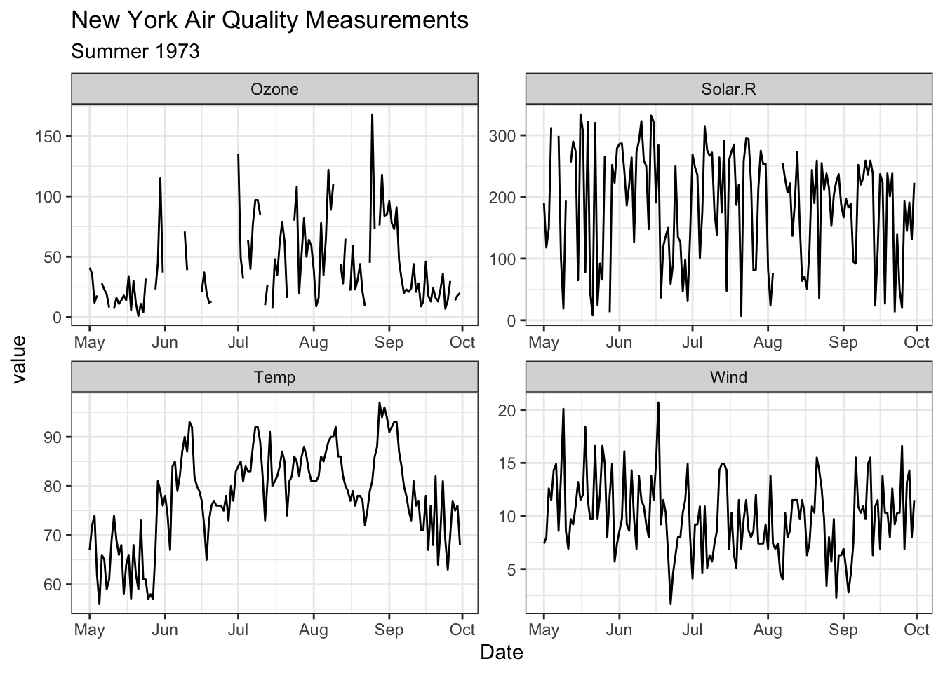 # Using facetsggplot(d_long,aes(x = Date,y = value )) +geom_line() +facet_wrap(~ Measurement, scales ="free") +labs(title ="New York Air Quality Measurements",subtitle ="Summer 1973" )