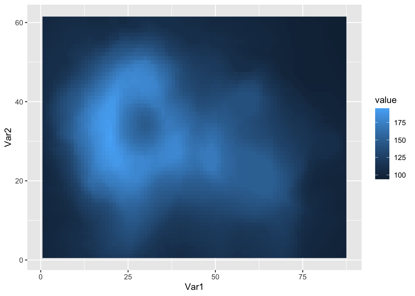 # Heatmap# Tidy the datad <- reshape2::melt(volcano) # similar to tidyr::pivot_longerggplot(data = d, mapping =aes(x = Var1, # Var1, Var2, and valuey = Var2, # are the default namesfill = value)) +# used by `reshape2::melt()`geom_raster()