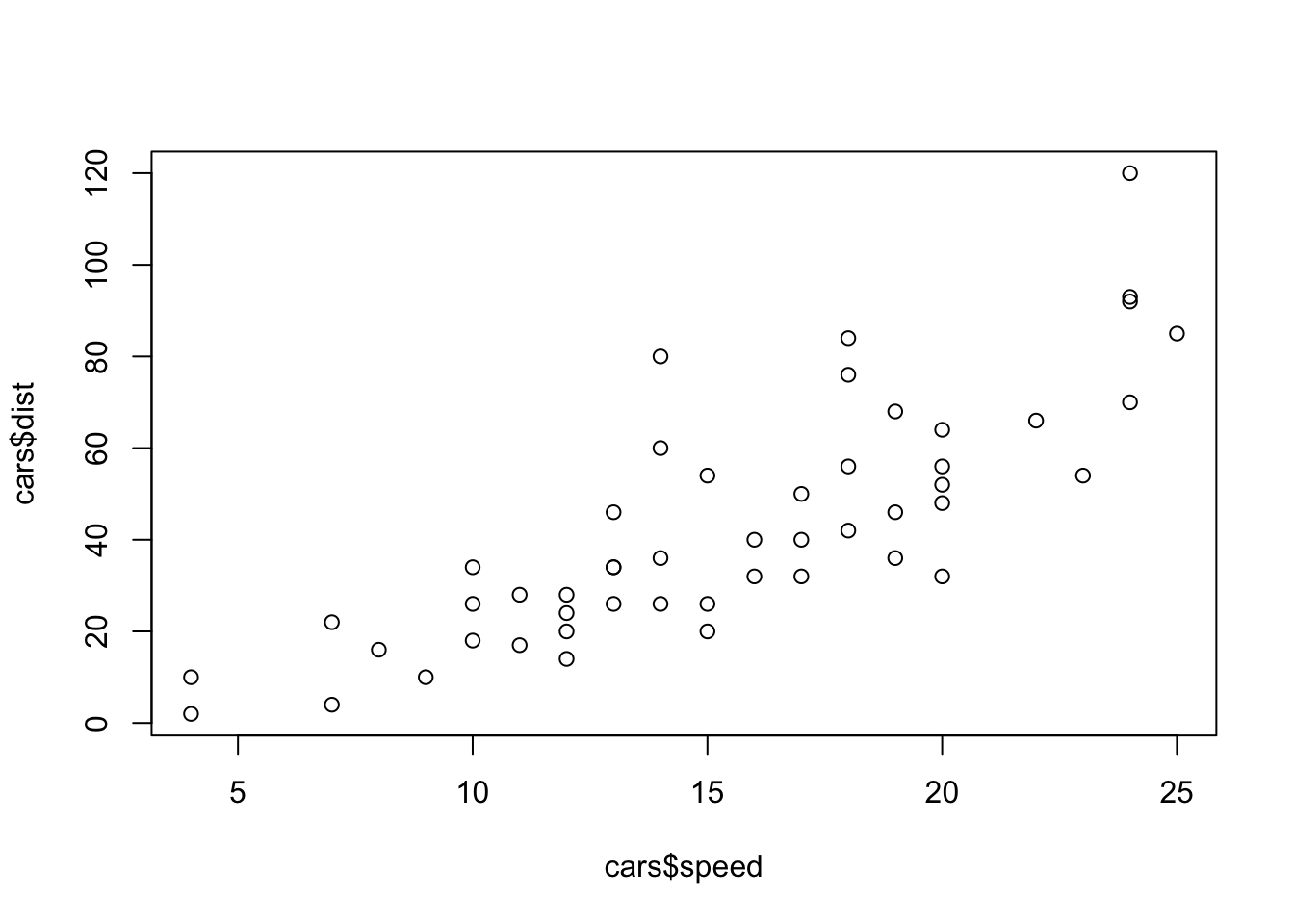 plot(x = cars$speed, y = cars$dist) # or